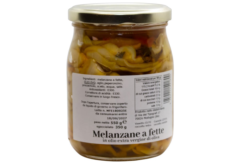 Melanzane sottolio lavorate come vuole l’antica tradizione. Raccolte e subito sbucciate a mano. Sono sottili e bianche, con pochi semi. Lavorate con sale e aceto e conservate con solo olio extra vergine d’oliva.